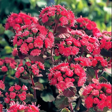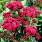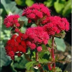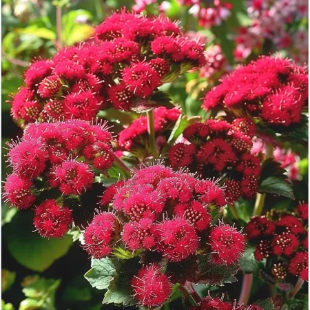 Agératum je majhen grm z ovalnimi listi in rdečimi cvetovi.