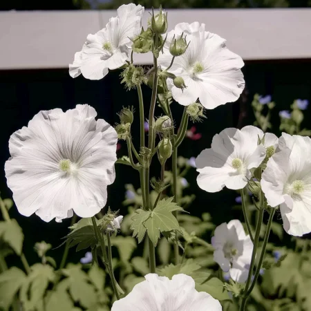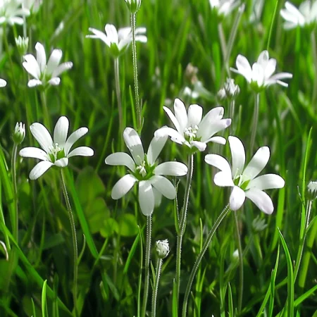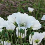 Enoletna poljska roža z nežnimi, snežno belimi cvetovi na tankih steblih.