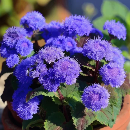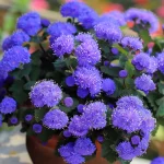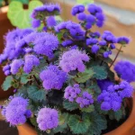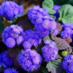 Agératum je majhen grm z ovalnimi listi in modrimi cvetovi.